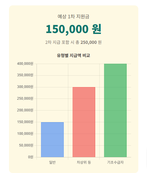 아래 항목을 선택하시면 예상 지원금을 바로 계산해 드립니다. 이 계산기는 1차 지급액을 기준으로 하며, 소득 상위 10%를 제외한 대상자는 2차 지급 시 10만원이 추가됩니다.